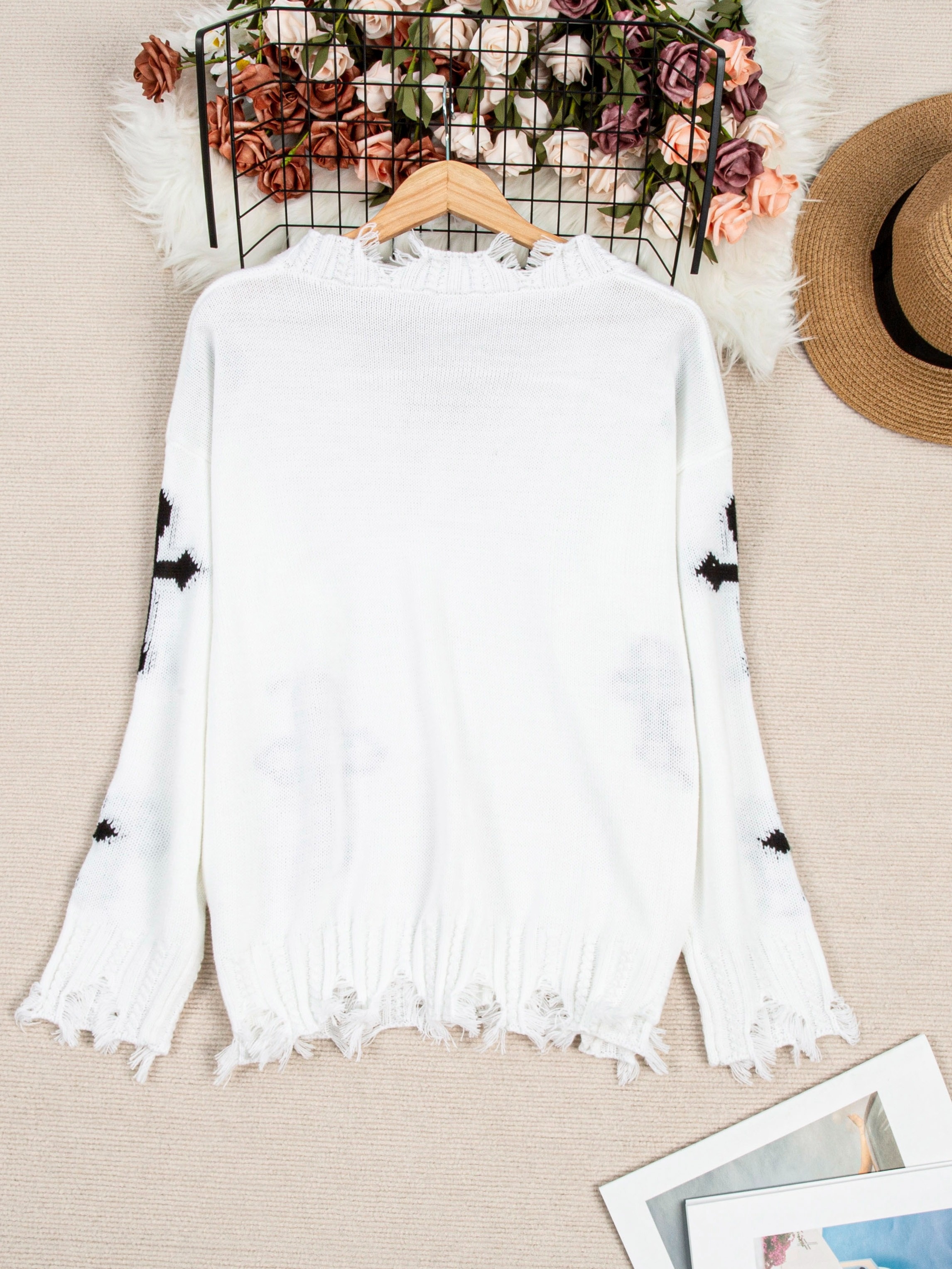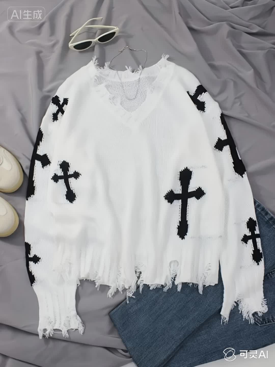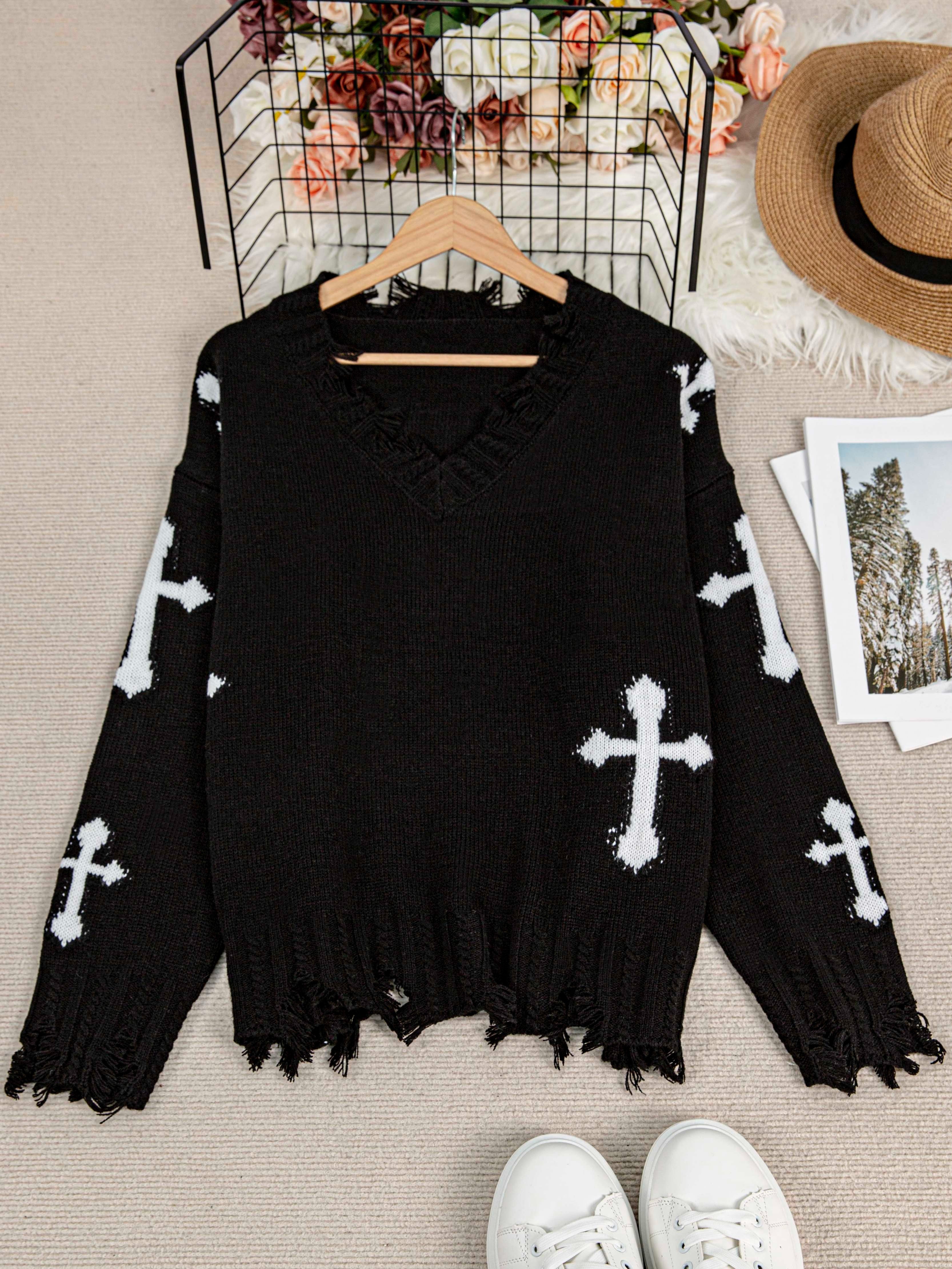 Plus Size Cross Pattern Knit Sweater, Casual Long Sleeve V Neck Raw Hem Top For Fall & Winter, Women's Plus Size Clothing