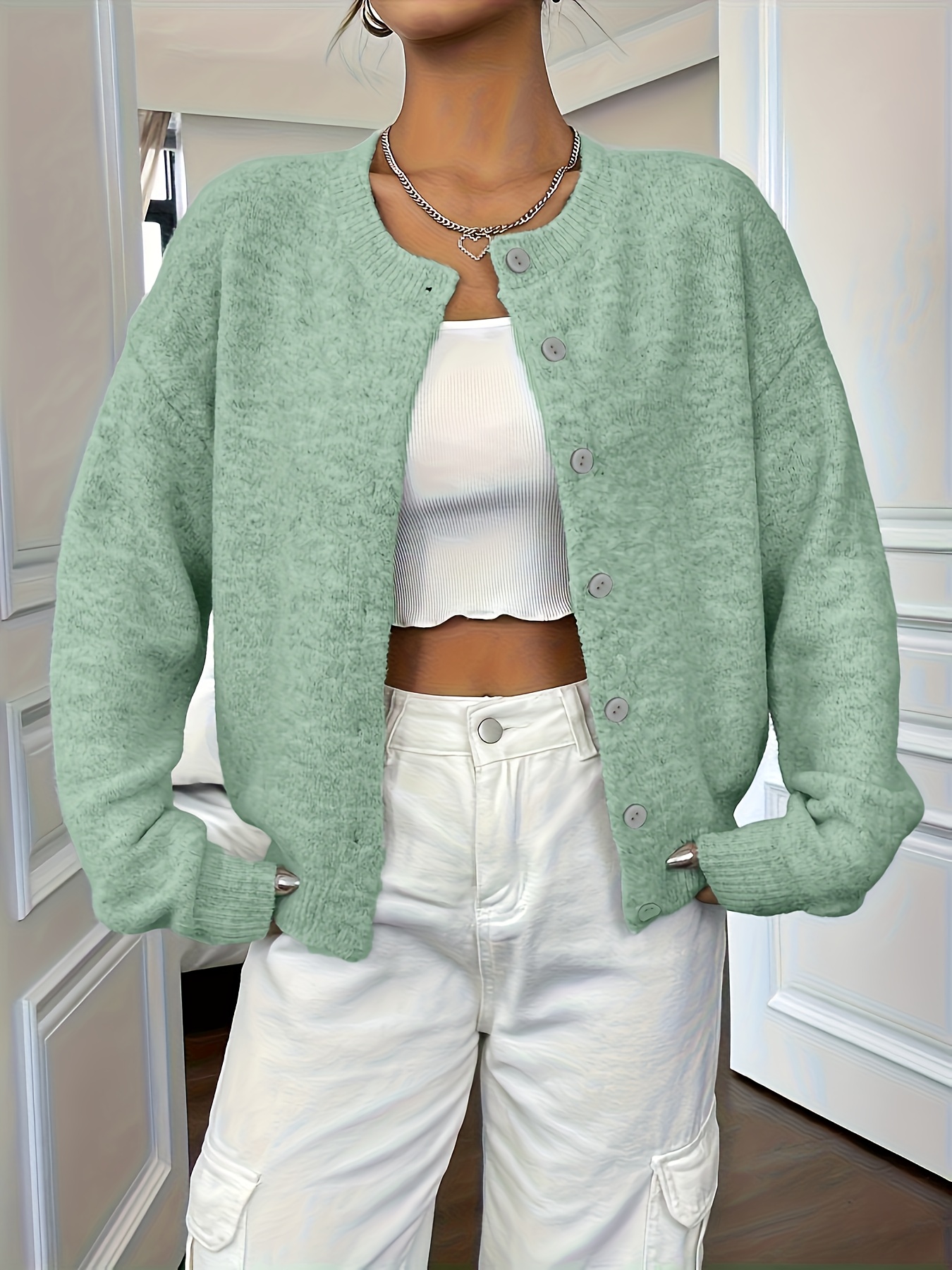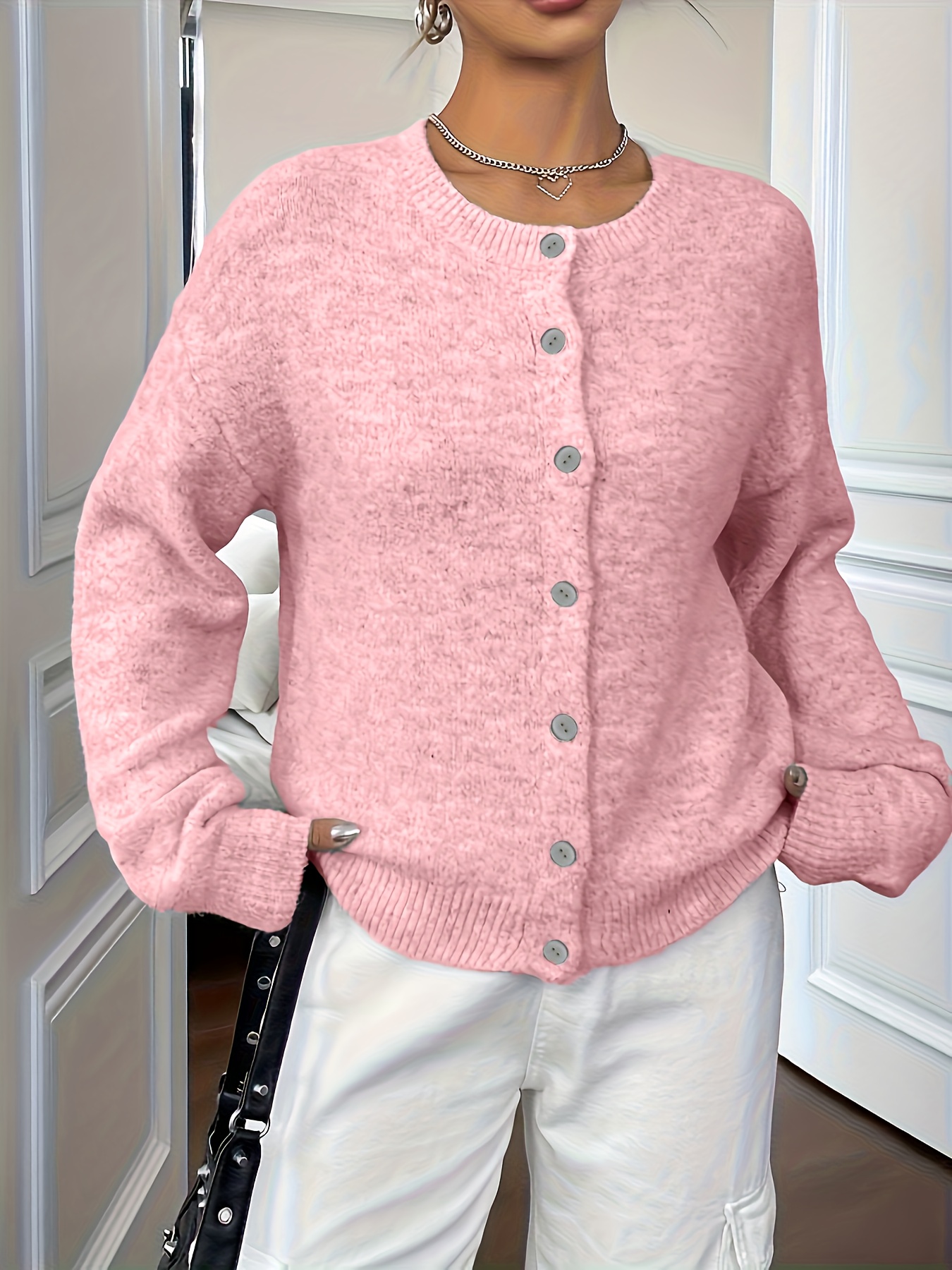 Plus Size - Plus Size - Women'S Elegant Solid Color Long Sleeve Cardigan - Soft Stretchy Button-Front Open Front Sweater, Round Neck Fall/Winter Coat for Casual & Formal Outfits, Cardigan Sweater, Winter Clothing, Stylish Knitwear, Office Wear