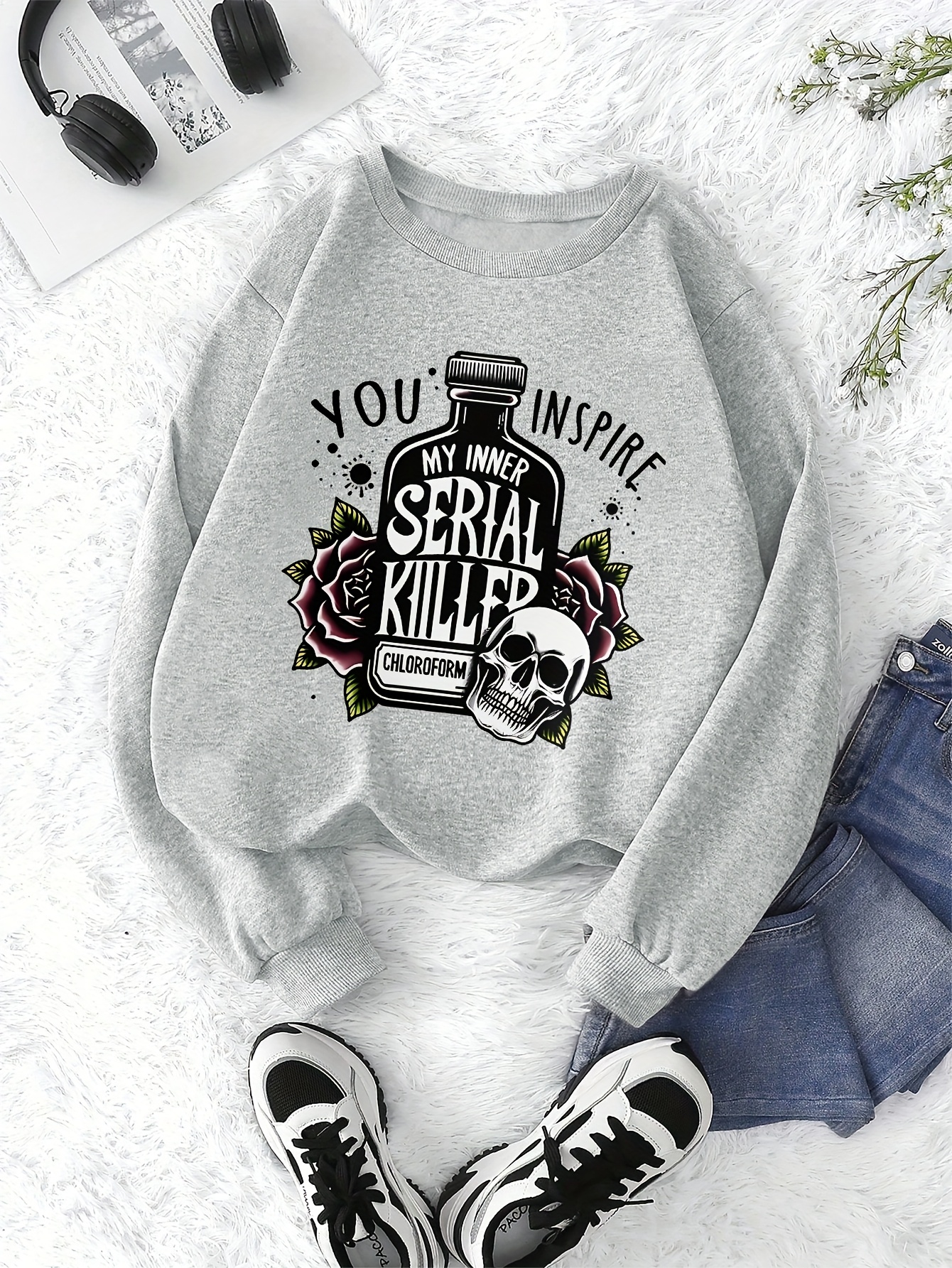 Women'S Casual Crew Neck Sweatshirt with Dark Humor "You Inspire My Serial Killer" Print - Black Skull & Roses Design, Fall & Winter Clothing, Fall Winter Apparel | Playful Graphic Top | Comfortable Fit, Sweater Hoodie