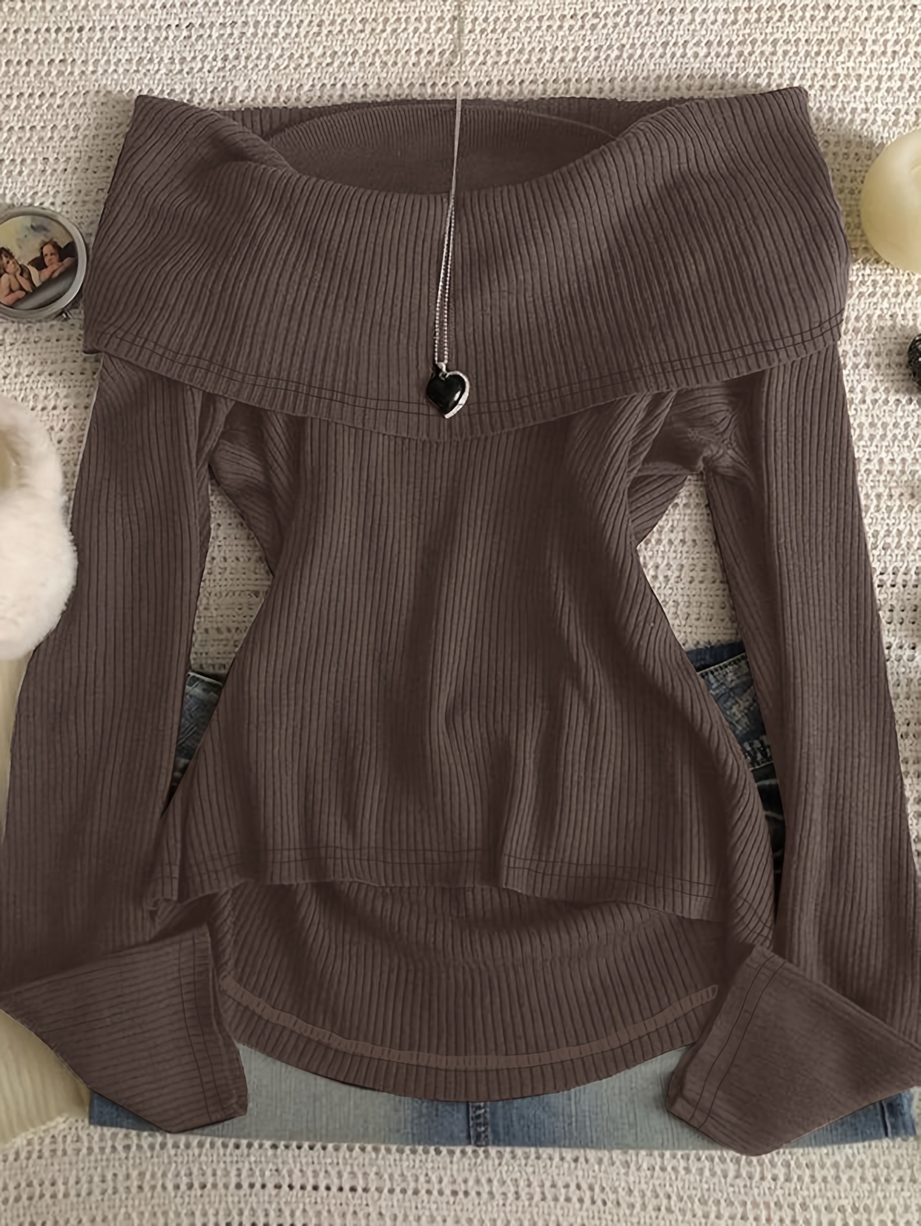 Women's Elegant Asymmetrical hem long Sleeve T-Shirt - Chic Brown Tops for Casual & Formal Outfits - Machine Washable Everyday Women's Fashion Blouse, Office Attire, Modern Style, Medium Stretch, Stylish Shirt, Office Women