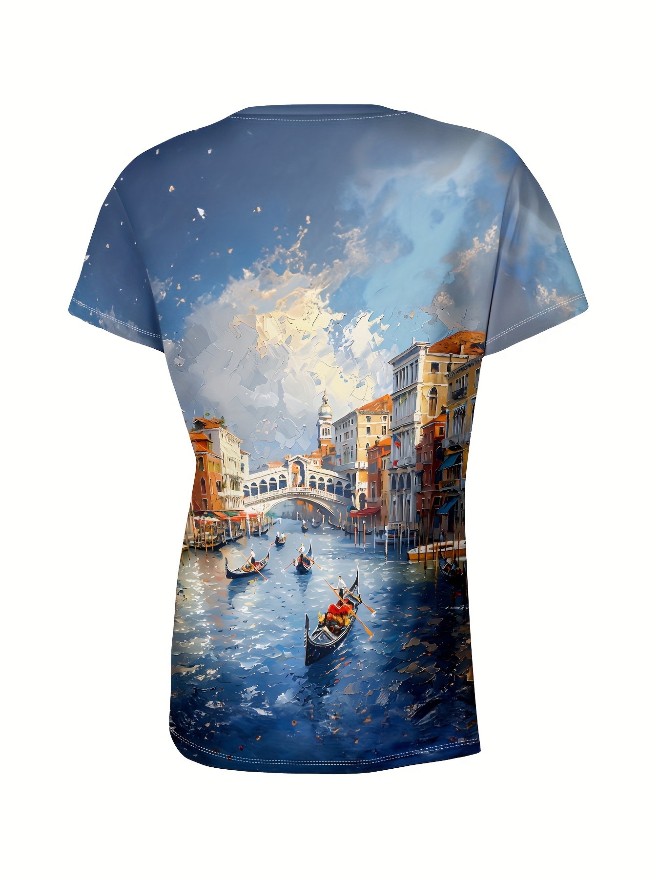 Women's Venice Gondola & Rialto Bridge Print Short Sleeve T-Shirt - Vibrant Venetian Canal Scene, Breathable Round Neck Casual Top for Spring/Summer, Machine Washable, Summer Clothing, Artistic Scene Tee, Nontransparent Fabric