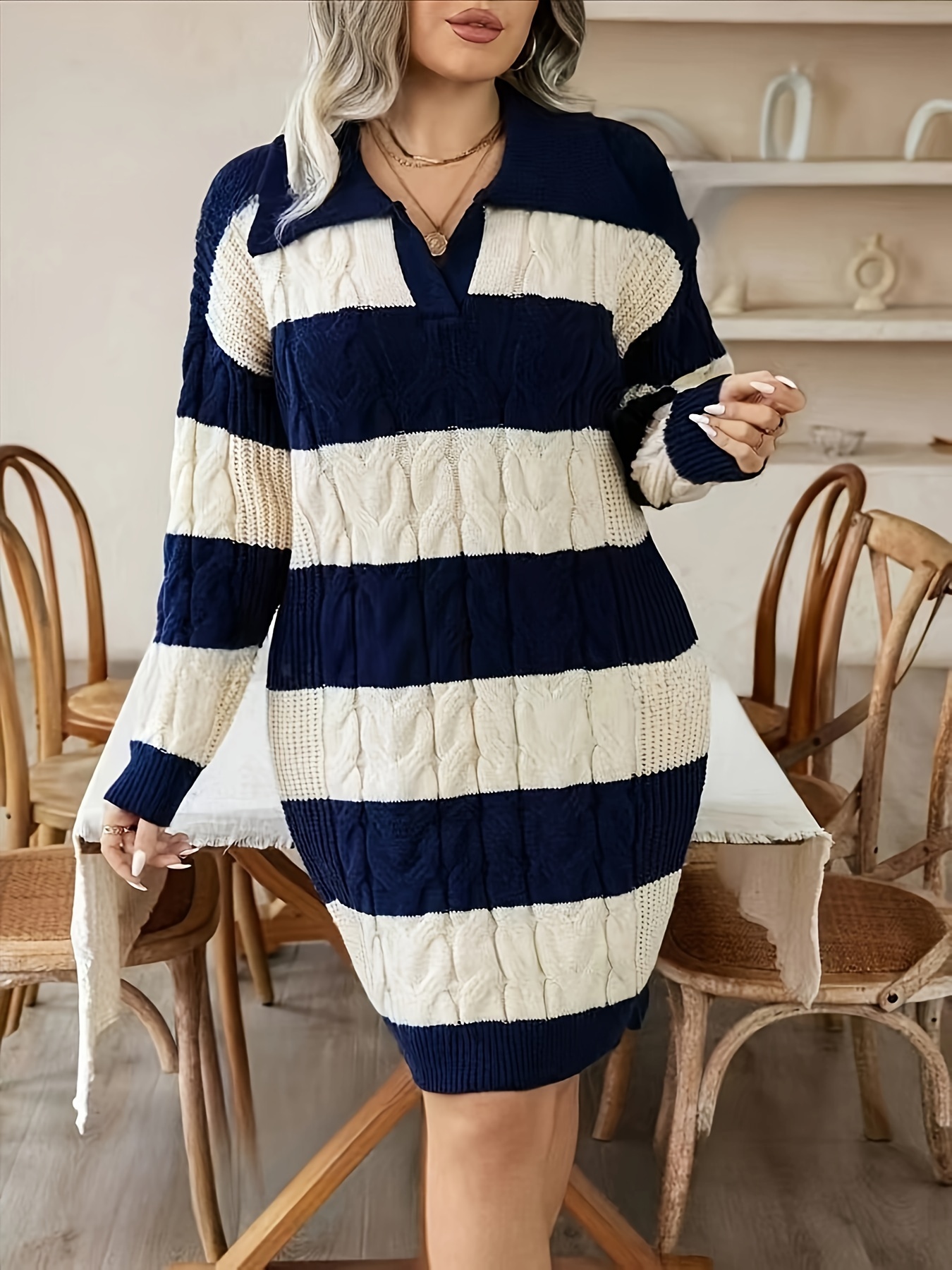 Elegant Plus Size Striped Sweater Dress Polyester Knit Fabric - Lapel Collar Long Sleeve Drop Shoulder Midi Dress with Medium Stretch for All Seasons