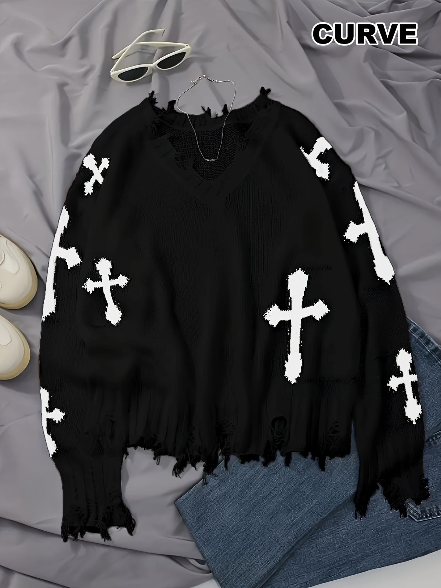 Plus Size Cross Pattern Knit Sweater, Casual Long Sleeve V Neck Raw Hem Top For Fall & Winter, Women's Plus Size Clothing