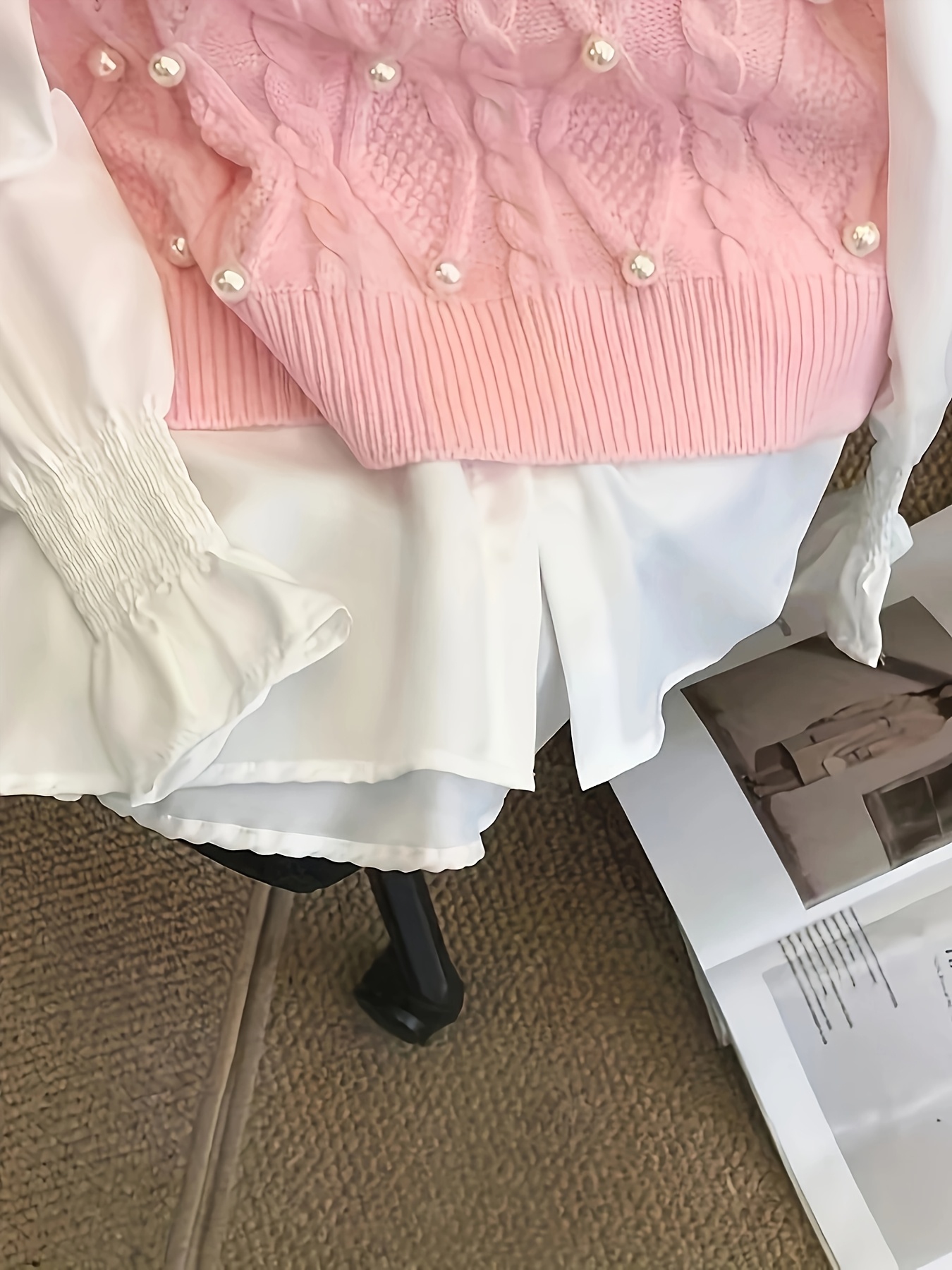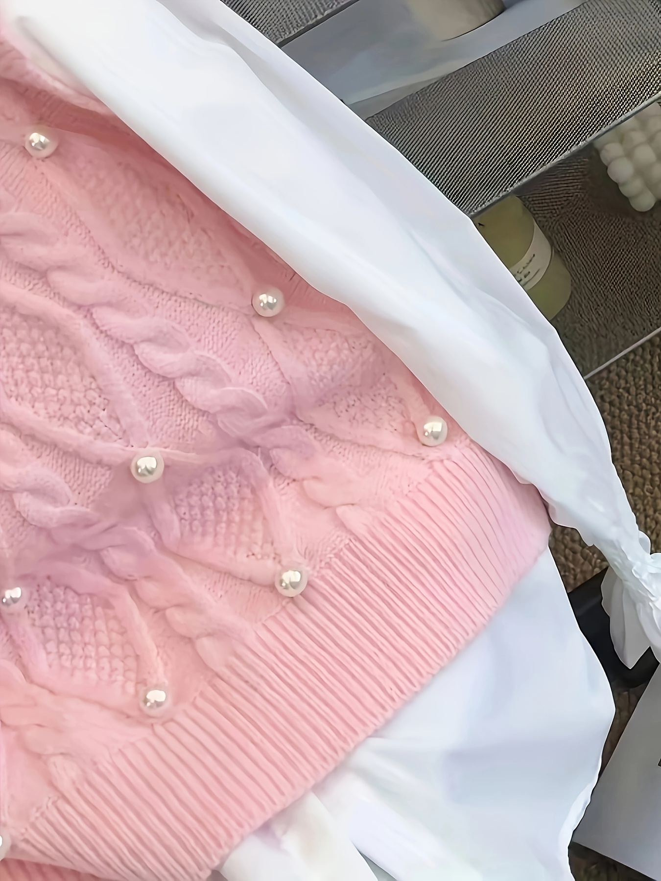Plus Size, Plus Size Women's Elegant Pearl-Embellished Soft Pink Vest - Round Neck Sleeveless All-Season Versatile Layering Piece for Casual & Formal Outfits, Seasonal Fashion, Sophisticated Weaving