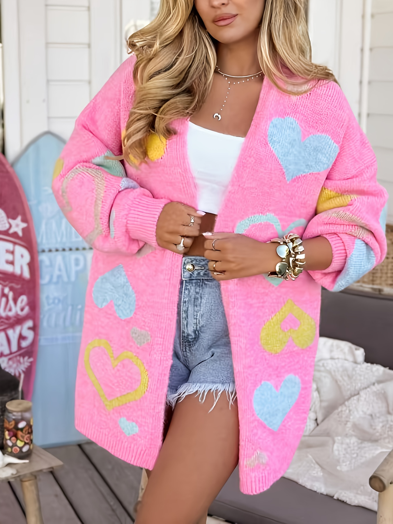 Plus Size - Women'S Pink Heart Pattern Cardigan - V-Neck, Long Sleeve, Mid-Length Open Front Sweater for Fall/Winter, Casual Style with White Top and Jeans, Cardigan Sweater